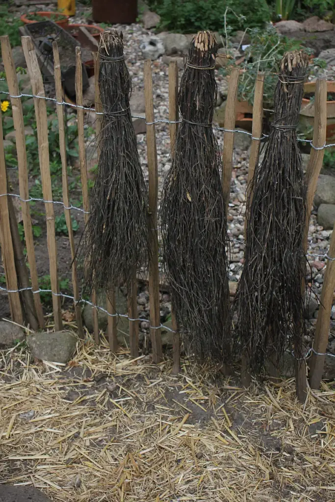 - Vorbereitung: Sammle dünne Birkenzweige und kürze sie auf etwa 50–60 cm. Nimm jeweils so viele Zweige, wie du mit deiner Hand fest greifen kannst. So hast du den ersten Reisigbündel. Wenn die Reisigzweige spröde sein sollten, kann man sie über Nacht in Wasser „einweichen“. Dann sind sie am nächsten Tag wieder elastisch.