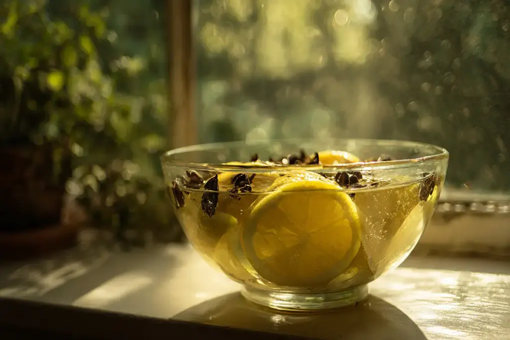 Legt die Zitronen und Nelken in die Schale mit Wasser. Diese gefüllte Schale stellt ihr an ein Fenster eurer Wahl.