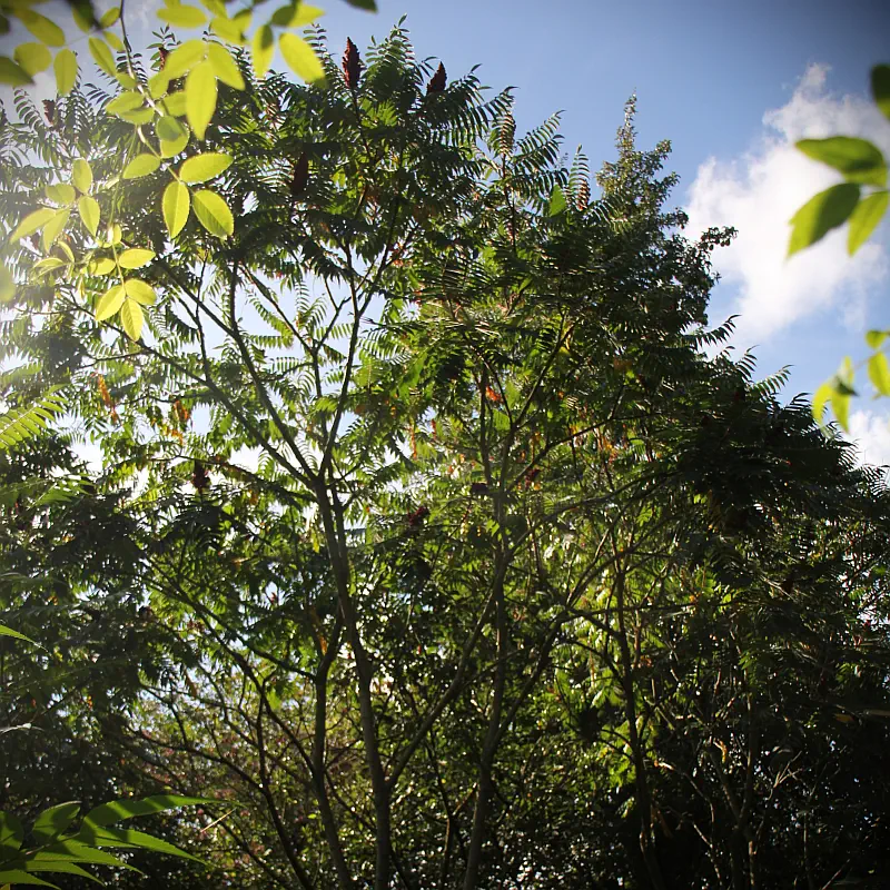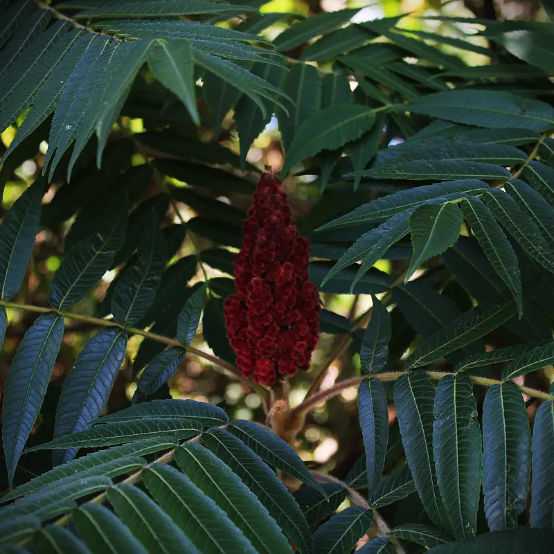 Der Essigbaum, auch Hirschkolben-Sumach genannt (Rhus typhina), ist hier in Deutschland leider in den Verruf gekommen, giftig zu sein. Doch das ist er nicht; nur seine anderen, nicht heimischen, Vertreter sind giftig.