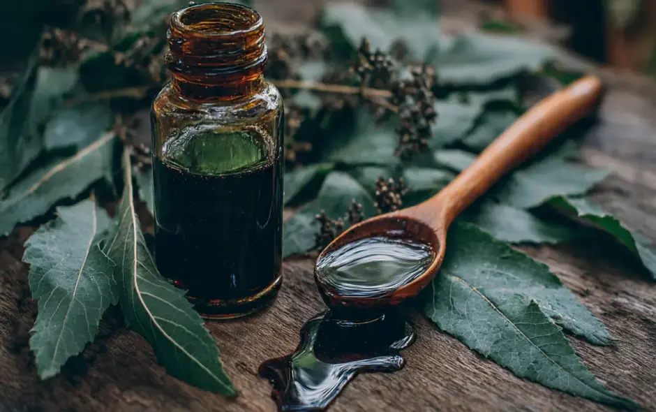 - Abfüllen: Nach der Ziehzeit werden die Holunderblätter abgefiltert und das aufgefangene Holunder-Öl in dunkle Flaschen umgefüllt.