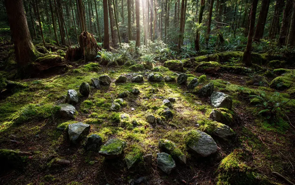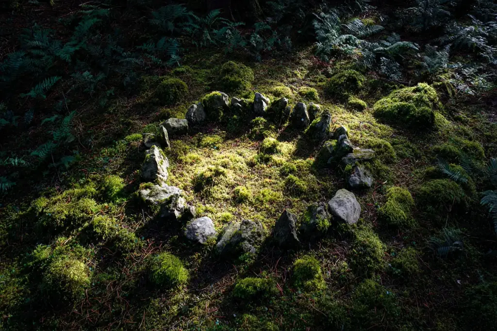 Ihr könnt auch so einen Kreis in einem Wald errichten, indem ihr große Steine kreisförmig anordnet. In einem Wald ist es am natürlichsten. Denn er spendet uns Kraft, klärt und erdet unseren Geist.