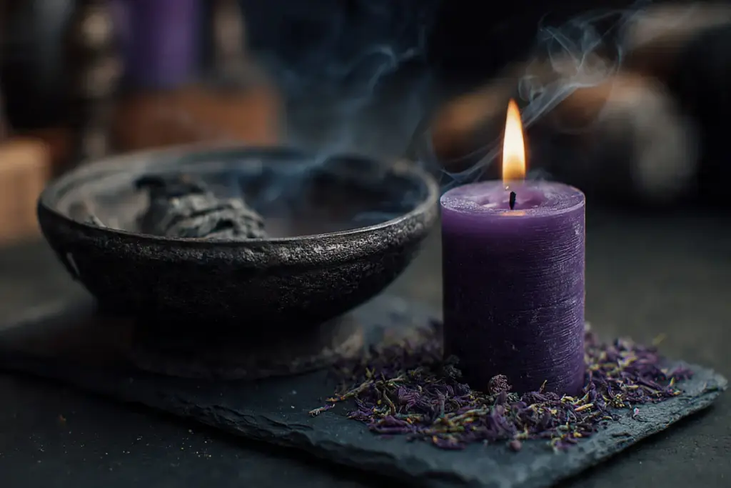 Die violette Kerze: Bei Schutzräucherungen sollten die Kerzen durchgefärbt und violett sein. Die Kerzen, die nur von außen mit der Farbe ummantelt werden und innen weiß abbrennen, taugen nichts und sind mindere Qualität. Violett ist die Hauptfarbe bei Schutzräucherungen, denn sie vermittelt uns Selbstbewusstsein und Konzentration. Zwei Eigenschaften, die wir für unseren Schutz dringend benötigen.