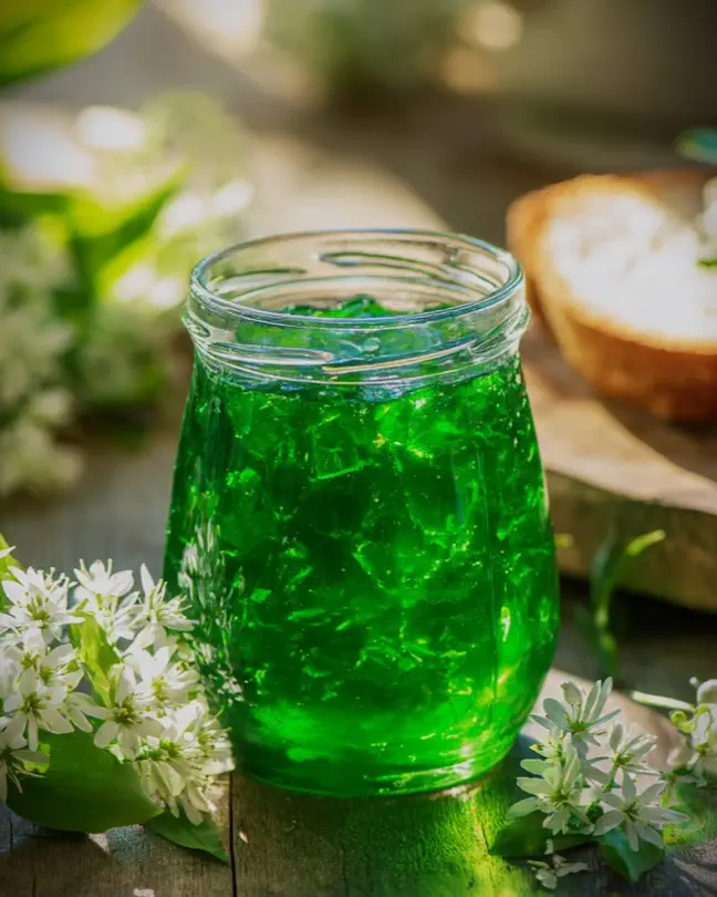 - Abfüllen: Nun füllt ihr euer Waldmeistergelee in sterilisierte Gläser und fügt noch jedem Glas ein Waldmeisterblatt als Dekor hinzu und verschließt alles gut.